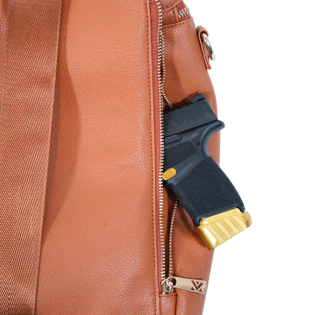- Secure Gold Hardware & Metal Zippers: The concealed carry compartment is secured with a high-quality gold metal zipper, ensuring that your firearm is quickly accessible in an emergency situation.